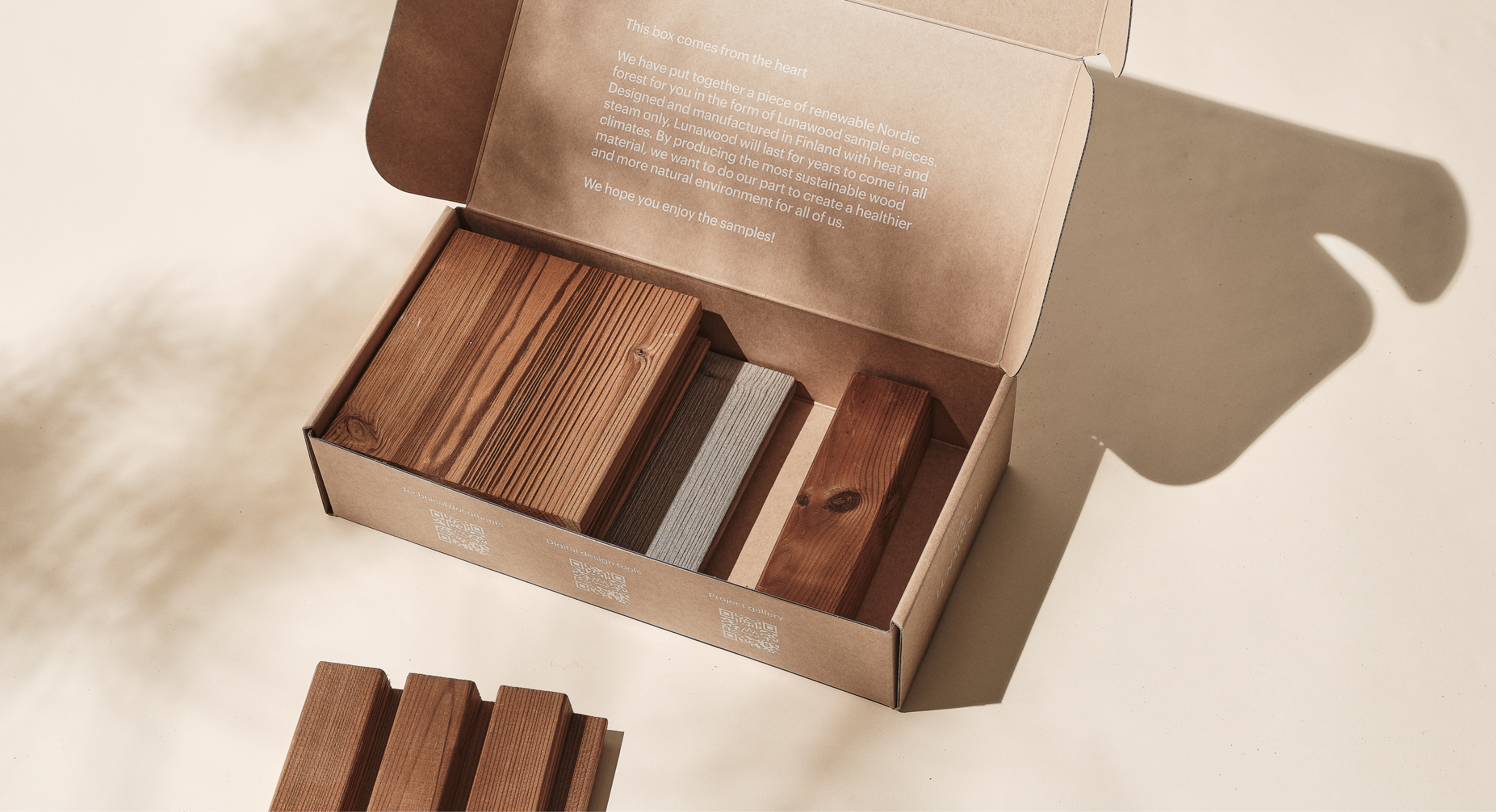 Projete com Lunawood utilizando o nosso serviço exclusivo de amostras gratuitas. Descubra a qualidade e versatilidade desta madeira termotratada nórdica e inspire-se para criar ambientes únicos.