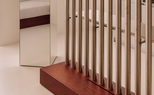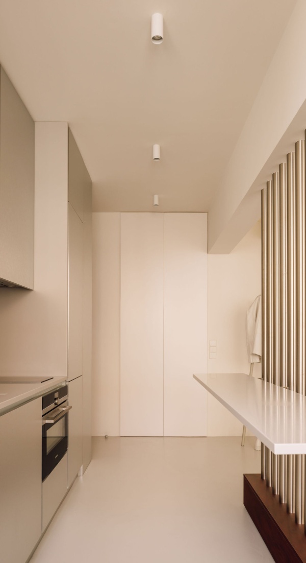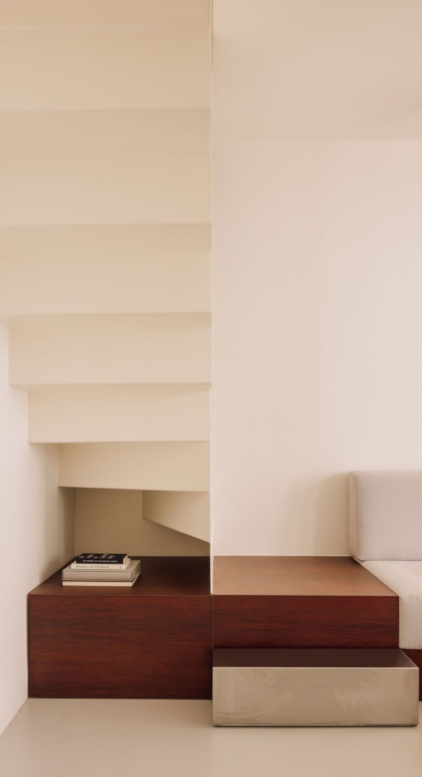No piso inferior passou a existir um único espaço, com uma estrutura central que media e dá apoio os espaços da cozinha e da sala. A volumosa escada existente foi substituída por uma leve e delicada estrutura metálica, que tira partido do pé-direito duplo. Os vãos interiores foram redimensionados, e o sistema de carpintaria foi integralmente redesenhado, contemplando novas peças de mobiliário, em madeira e aço inox, que completam a intervenção.Os materiais