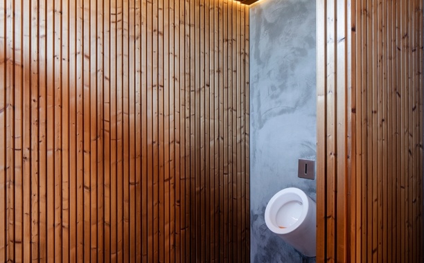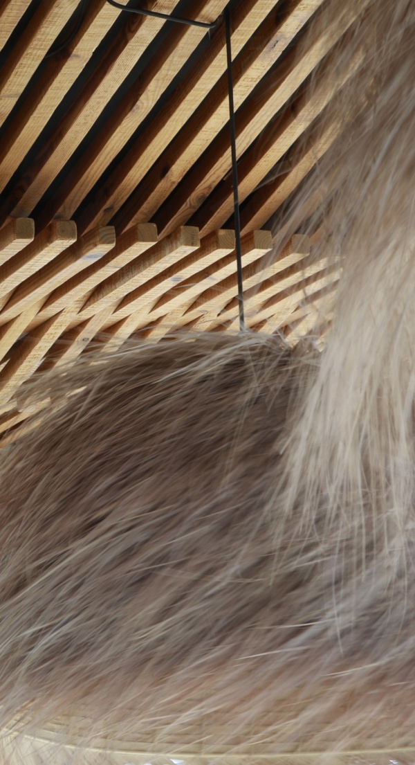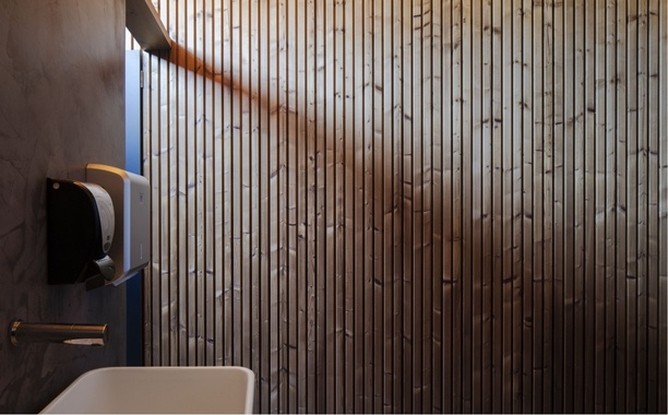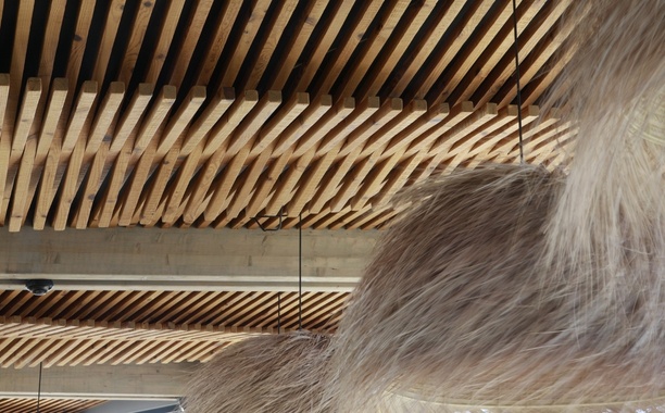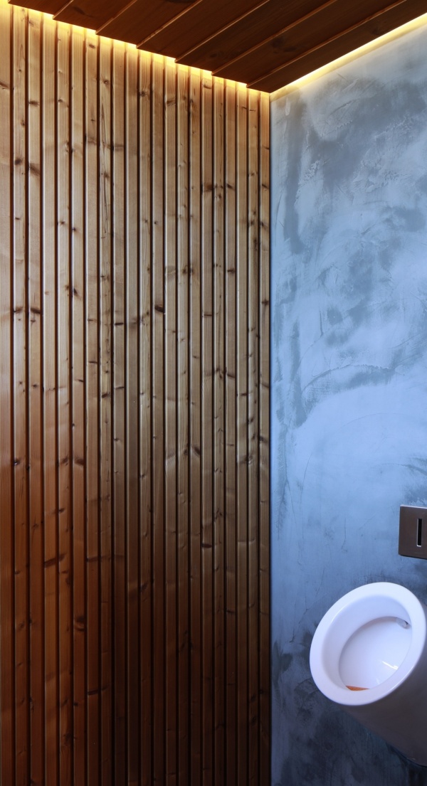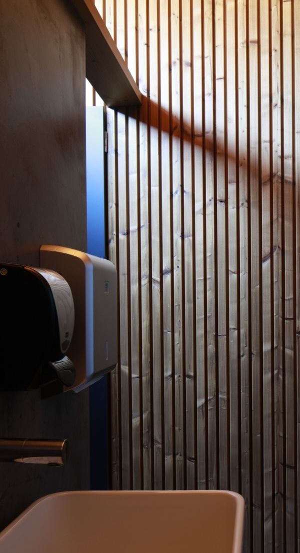 Tanto os interiores como os revestimentos exteriores são construídos com junta seca, sem o uso de argamassas, utilizando madeira termo modificada da Lunawood e vidro para a envolvente externa. A cobertura inclinada é composta por painéis sanduíche de madeira, impermeabilizados com tela de PVC e rematados com rufos de zinco. As áreas envidraçadas são projetadas com três folhas, sendo duas fixas e uma móvel de abertura em guilhotina para permitir ventilação natural. A área da esplanada é protegida por uma "trança" de madeira Lunawood em forma de espinha de peixe, estendendo-se até ao teto do interior.