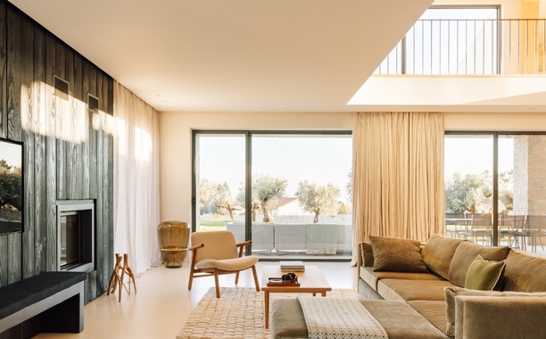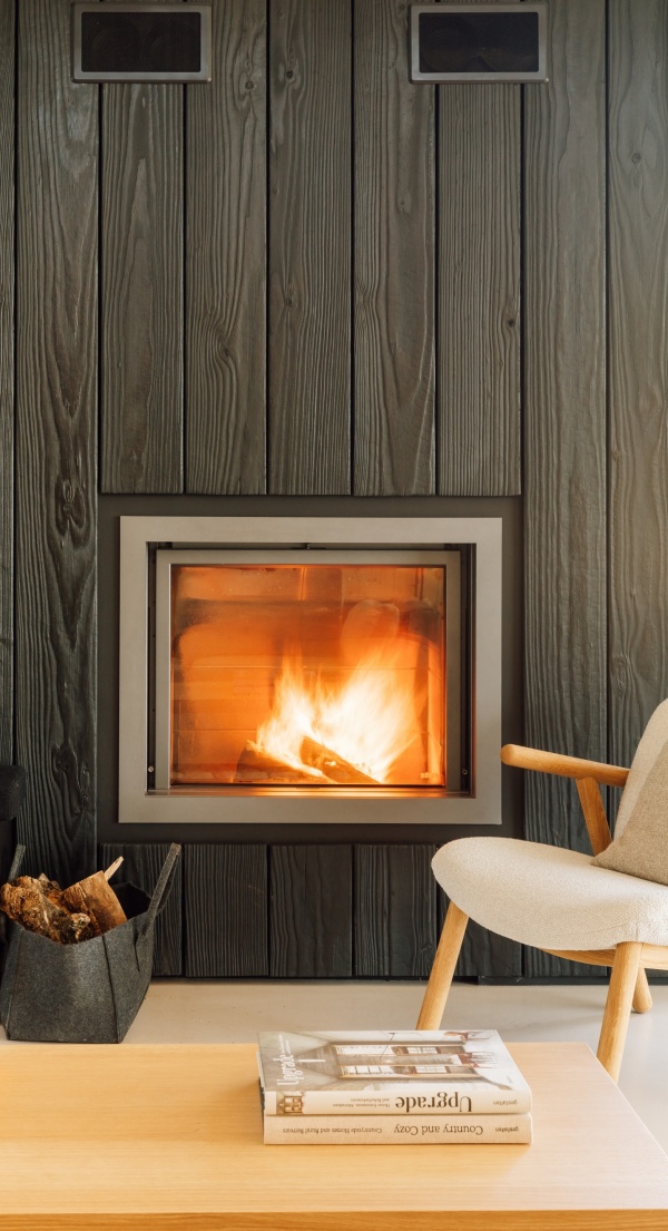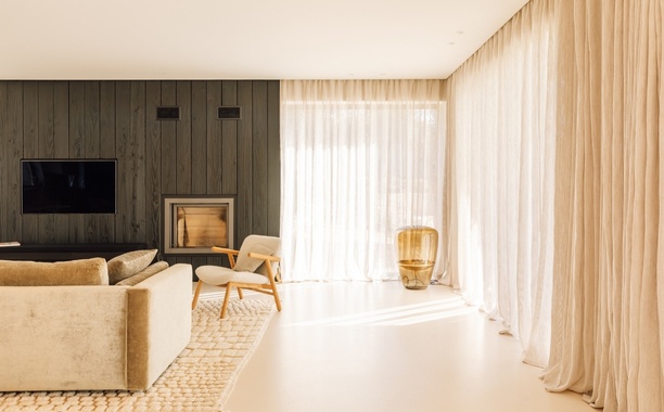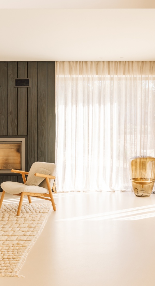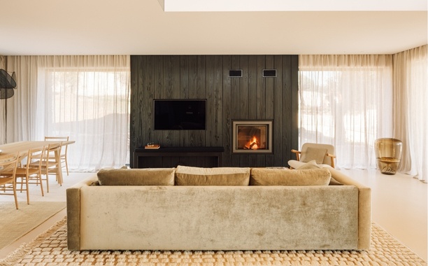 A sala foi desenhada em função de um módulo central que abraça a lareira e a televisão. A presença do ecrã é absorvida pelas réguas de madeira queimada e à medida que a luz de final de tarde flui pela casa, é realçada a impressionante textura da madeira. Combinada com um confortável sofá de veludo, um tapete berbere marroquino e cortinas de linho, introduz o calor e aconchego que a noite pede.
