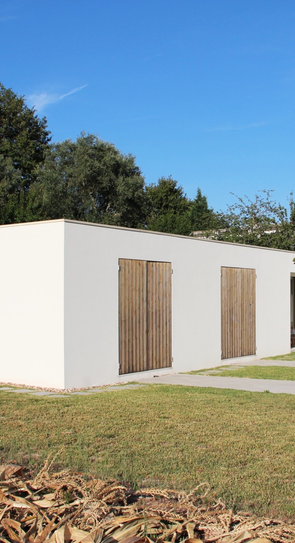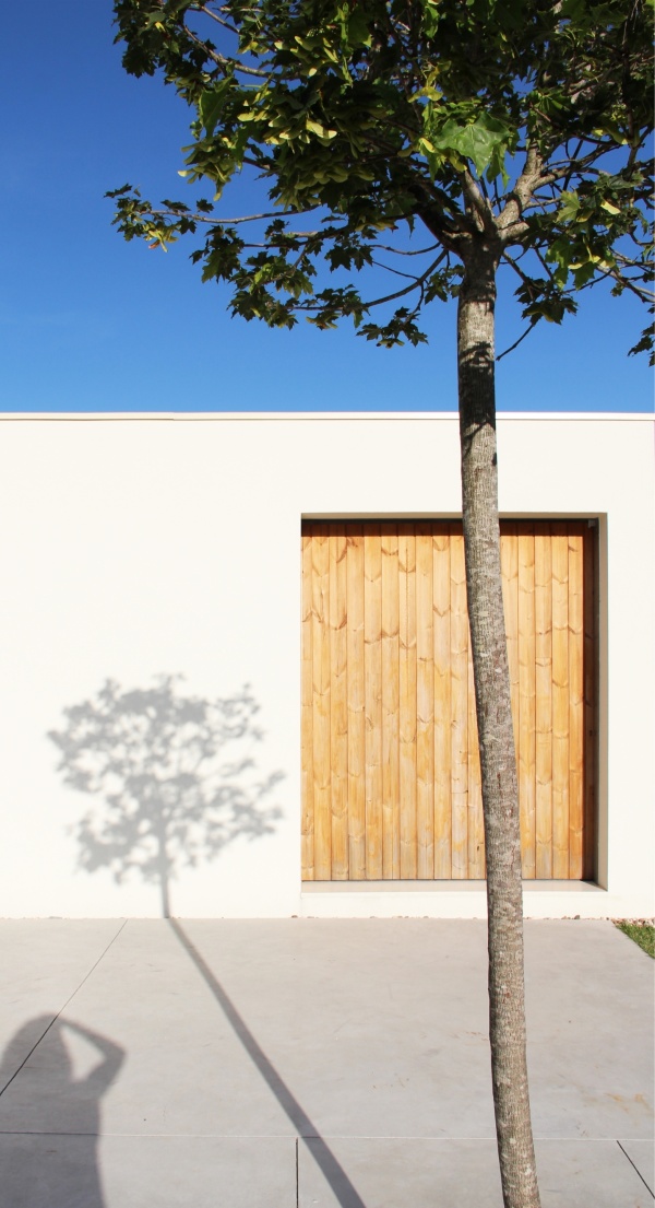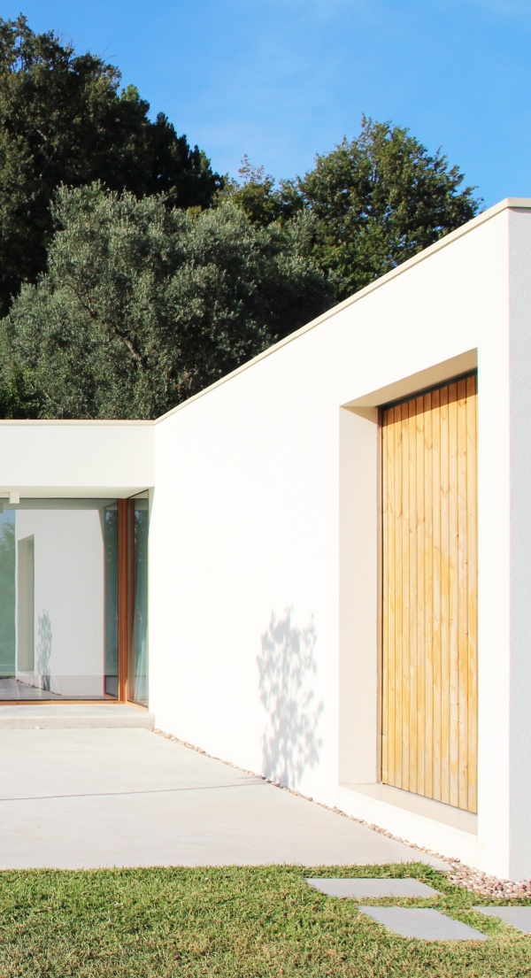 Uma casa onde a estrutura de betão aparente assume um papel principal na sua identidade e onde a natureza é parte integrante, não só através do pátio como da utilização das madeiras. As portas, portadas e portões exteriores em ripado Lunawood, proporcionam não só jogos de luz e sombra no interior da habitação, como exercem também um papel de controle da ventilação natural. Além disso, enriquecem as fachadas brancas limpas com a sua textura e cor orgânicas, sem medo de assumir o seu envelhecimento natural. A mistura minimalista dos materiais estruturais e industriais com a luz das grandes janelas e o conforto da madeira e do mobiliário interior atribuem a esta casa características intemporais.