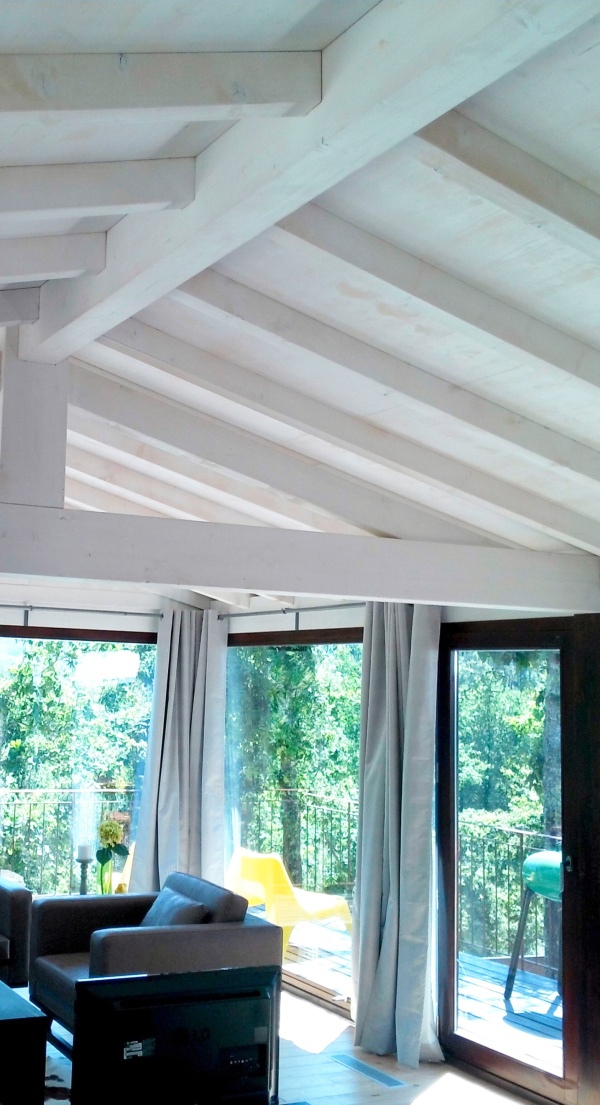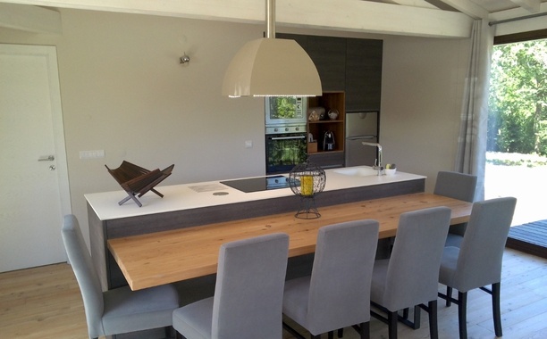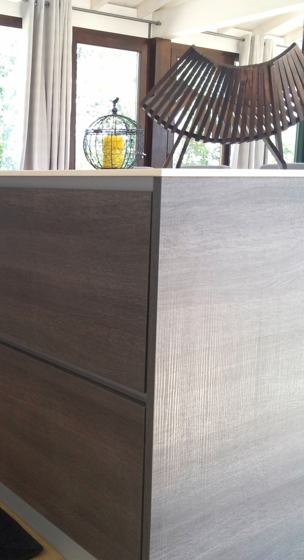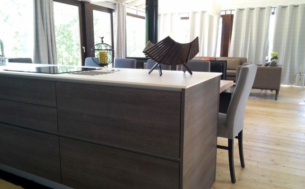 O projeto integra materiais das prestigiadas marcas Cleaf, Polyrey e Binderholz para conferir uma atmosfera única a cada divisão da casa. A melamina da Cleaf, presente nos revestimentos da cozinha, proporciona um toque de modernidade a este espaço. A aplicação menos convencional do painel thermoform da Binderholz no interior cria um contraste interessante com os painéis da Cleaf, resultando numa harmonia perfeita e acrescentando um toque de natureza ao ambiente. O tampo monocromático branco da Polyrey, em sintonia com as cores das paredes e do teto, serve como elo de ligação entre os diversos componentes aplicados. Já as vigas lameladas da Binderholz têm como principal função transmitir resistência, robustez e ruralidade ao espaço.