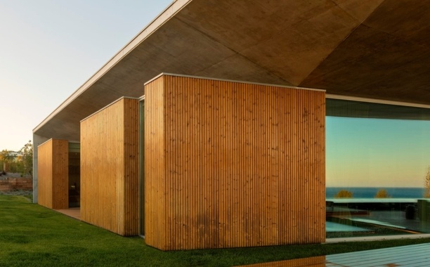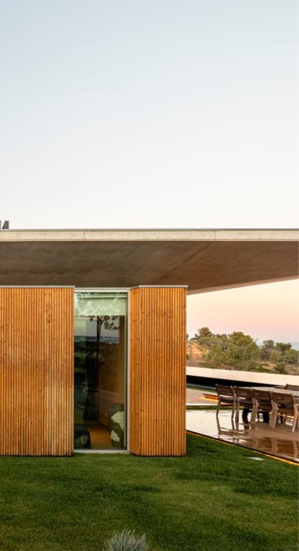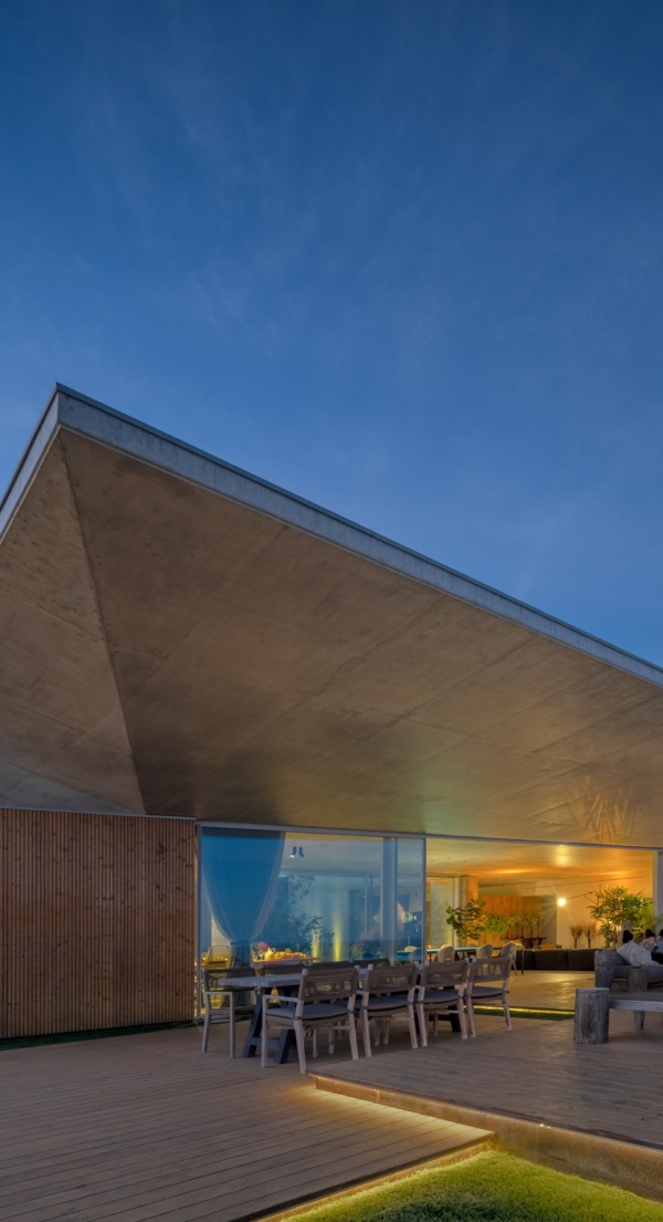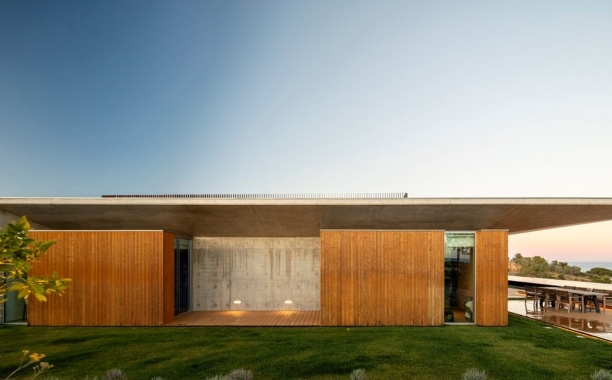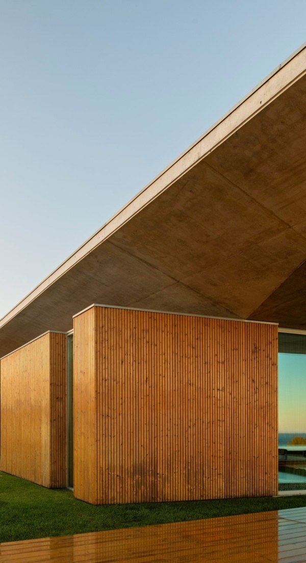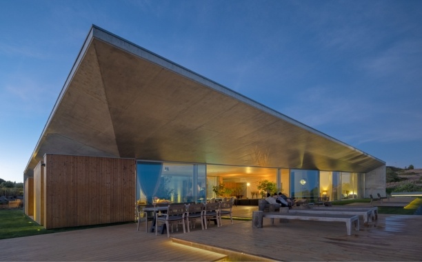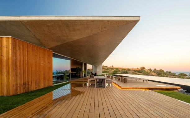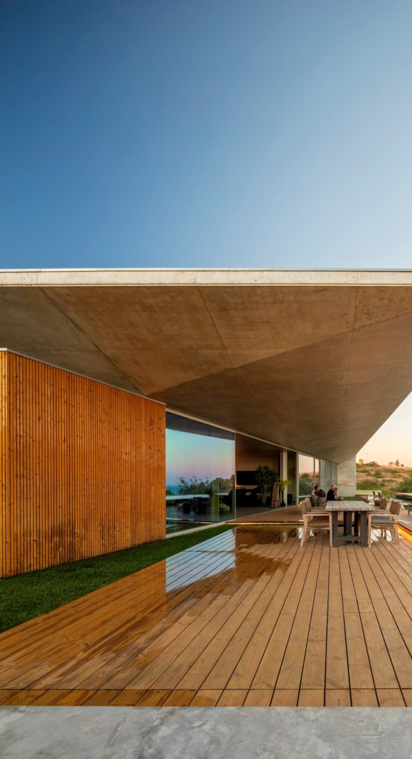 O peso do betão convive com a leveza de uma pala solta e da transparência das superfícies envidraçadas. Aquela pala solta e muito fina, em betão aparente, que se estende até ao envidraçado, que abriga e sombreia umas plataformas de madeira, que pousam delicadamente sobre o espaço ajardinado, é provavelmente o elemento mais marcante, pelo seu desenho e elegância. Esta encontra o seu contraponto na piscina, muito longa, que acompanha toda a frente da casa. A cobertura é acessível, para usufruir do espaço verde que a reveste e a liga a um jardim, que se quer simples, natural e com poucas necessidades hídricas. Recortam-se os volumes em betão, para criar um percurso. Um golpe de luz de poente anuncia uma poderosa porta em madeira, por onde se faz a entrada, junto ao pátio, o centro da casa, marcado por uma alfarrobeira. O pátio define os acessos, liga e separa as áreas sociais da sala e cozinha, voltadas a sul, das áreas mais privadas com quatro quartos, situados na ala nascente. A norte e poente surgem a garagem, áreas técnicas o outras zonas de apoio.