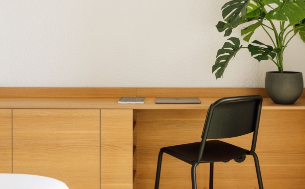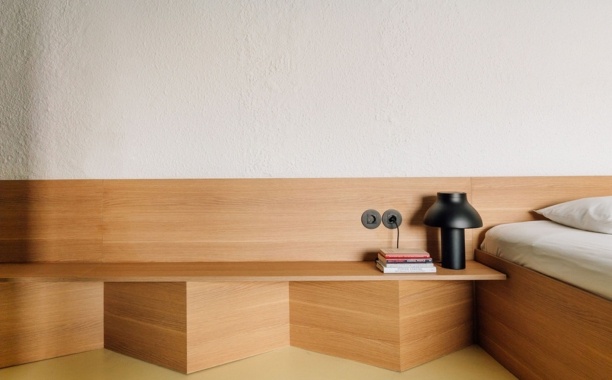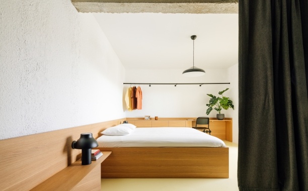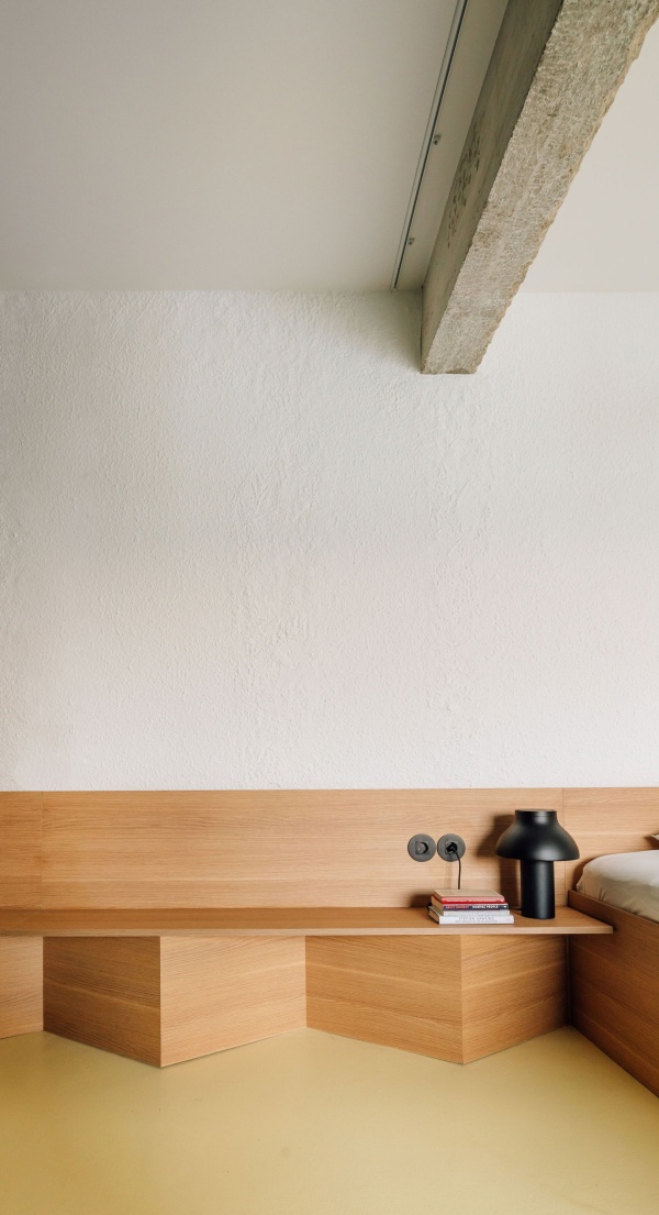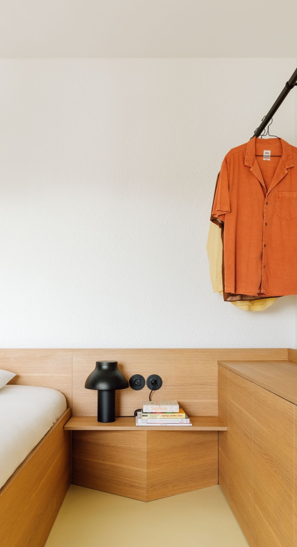 O móvel contínuo construído em forma de L ao longo de duas paredes do apartamento é um elemento que numa única leitura abraça várias funcionalidades, trazendo ao espaço uma sensação de unidade. Na entrada, funciona como móvel de apoio, baixo e longitudinal; na sua continuação, na área de maior extensão espacial, transforma-se numa cama com vista privilegiada para o exterior e é no seu plano perpendicular que se converte em área de arrumação e mesa de trabalho.Os materiais