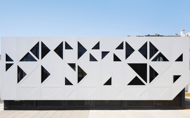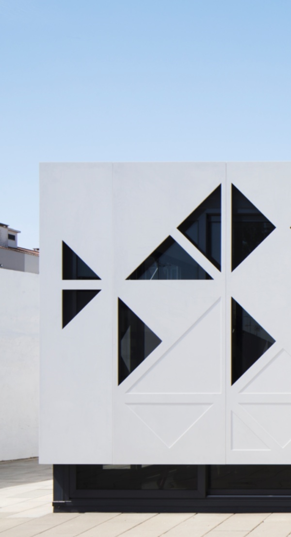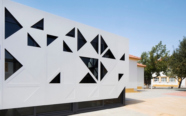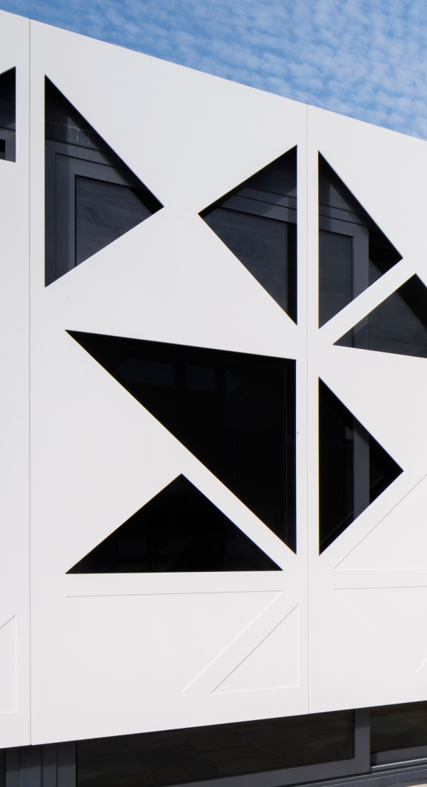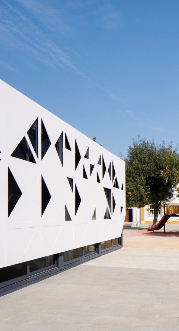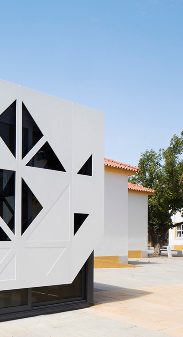 Este elemento de sombreamento foi criado em pedra acrílica branca da marca coreana Himacs, com recortes triangulares, cujo padrão foi inspirado nas grelhas triangulares presentes no edifício do refeitório e noutro edifício pertencente ao "Plano do Centenário". Este padrão é de particular importância, pois estabelece uma ligação visual entre as estruturas existentes e a nova intervenção. A reinterpretação do padrão triangular observado na escola serviu como principal inspiração para o design destes painéis Himacs, tornando-os no elemento mais distintivo de toda a proposta arquitetónica. A abertura dos “recortes” na superfície dos painéis está intrinsecamente ligada com a exposição solar e os níveis de privacidade que se quer no interior.