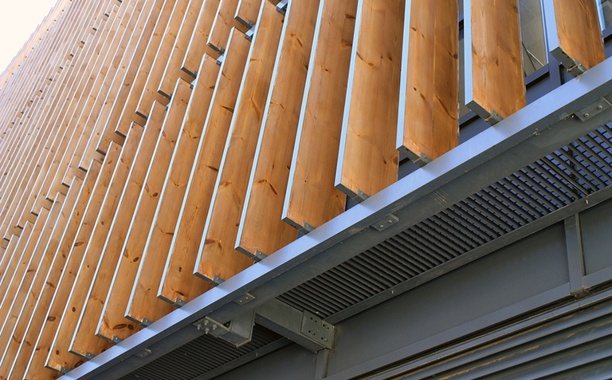 A estrutura do edifício combina elementos transparentes e opacos, utilizando vidro escurecido e painéis metálicos termolacados em tons de antracite para criar uma métrica regular na base. Nos pisos superiores, uma pele exterior reveste uma fachada “comum”, composta por lâminas verticais de madeira modificada Lunawood, apoiadas numa estrutura metálica. Esta pele atua como proteção solar e regula o ambiente interior, permitindo o sombreamento sem bloquear a vista para o exterior. A orientação das lâminas varia, criando diferentes texturas e sombras na fachada. O remate do edifício, com um piso recuado, também é revestido por uma pele protetora de alumínio termolacado em antracite.O perímetro