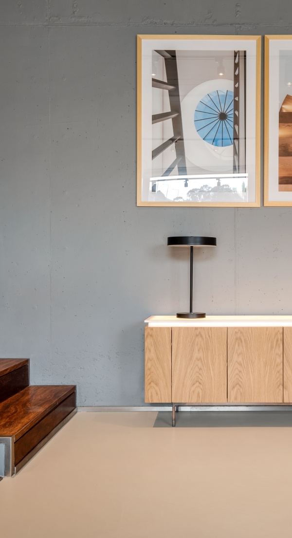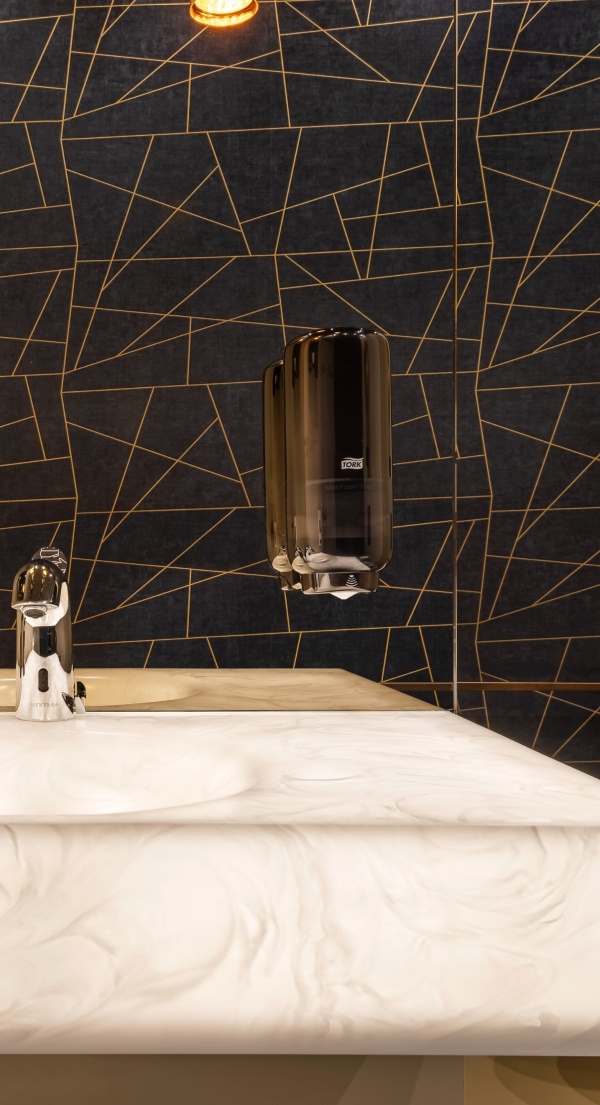 Neste projeto, foram escolhidos materiais inovadores para realçar a elegância do estilo industrial, destacando-se pela sua versatilidade e excelente capacidade de utilização em todas as áreas. Por estas razões, foi selecionada a pedra acrílica da marca Himacs na referência Pavia M603 nas secretárias, mobiliário, puxadores e nos espaços das casas de banho.