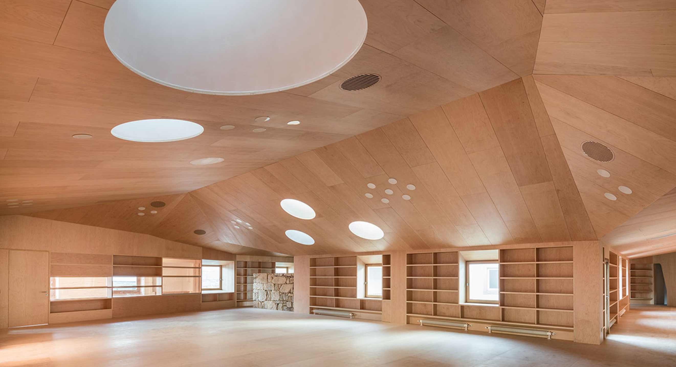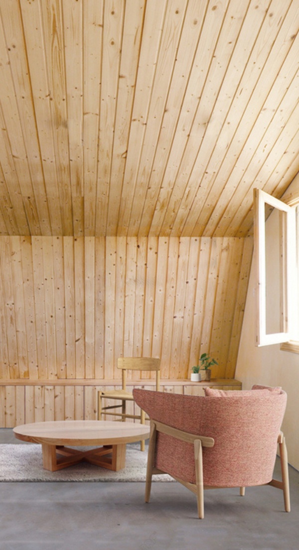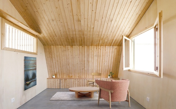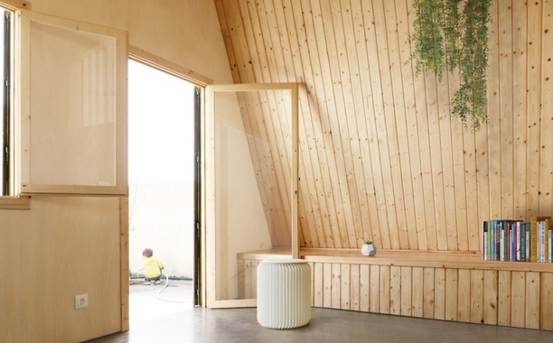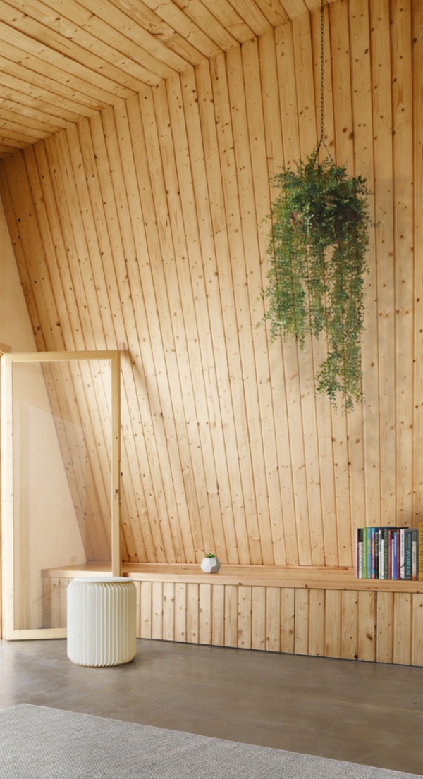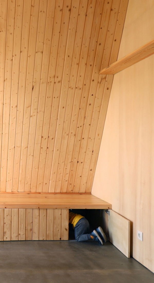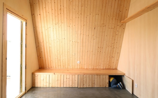 O material escolhido precisava de ser resistente, uma vez que estaria exposto ao sol e ao clima quente durante o verão, exigindo um bom isolamento e ausência de aberturas para o lado sul. Assim, optou-se por painéis de madeira cimento Viroc com verniz fosco para o piso, enquanto as paredes foram revestidas com contraplacado de choupo da marca Garnica para conferir uma aparência de madeira.